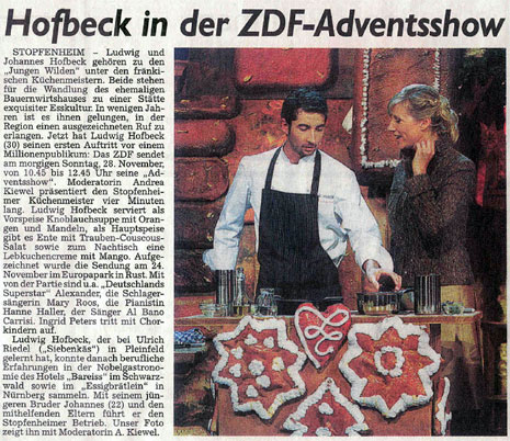 im rahmen der adventsshow im zdf präsentiere ich zusammen mit andrea “kiwi” kiewel mein weihnachtsmenü.ausgestrahlt wird die sendung am sonntag den 28.11.04ab 10.45 uhr im zdf.